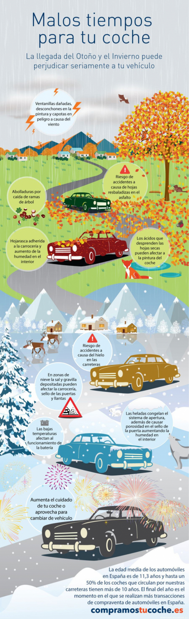 Porque la bajada de las temperaturas, las heladas, el aumento de las lluvias y las ráfagas de viento intensas pueden ser perjudiciales para nuestro vehículo, pero también pueden dificultar los viajes en carretera. Para que esto no sea un problema, en compramostucoche.es han elaborado una infografía detallada con toda la información sobre cómo le afecta el mal tiempo a los automóviles —a la pintura, a la carrocería y a la batería— y cómo empeora las condiciones de viaje.