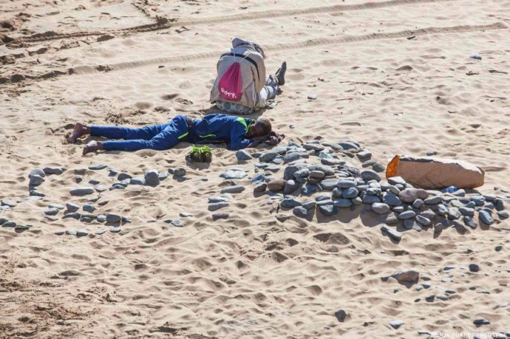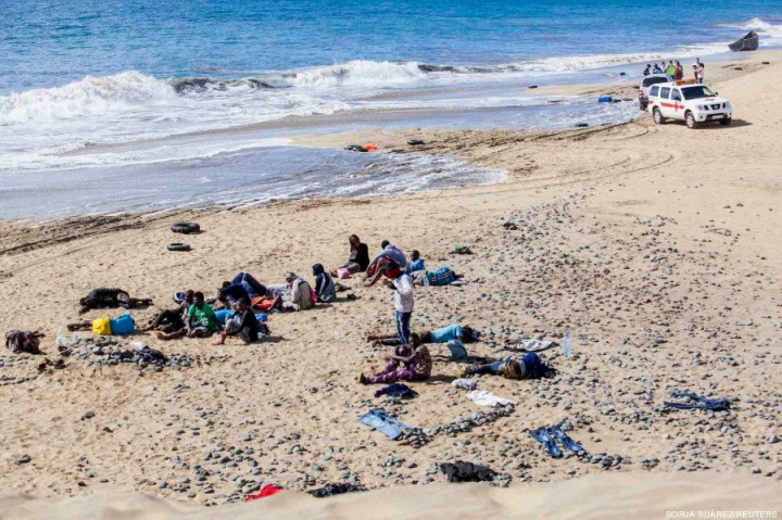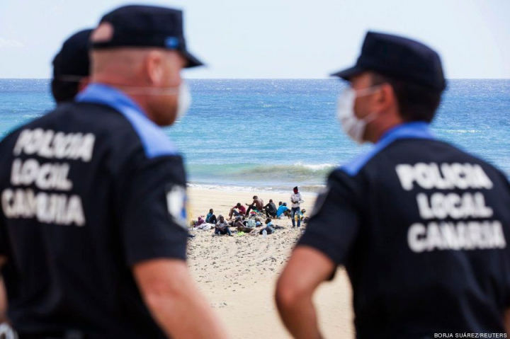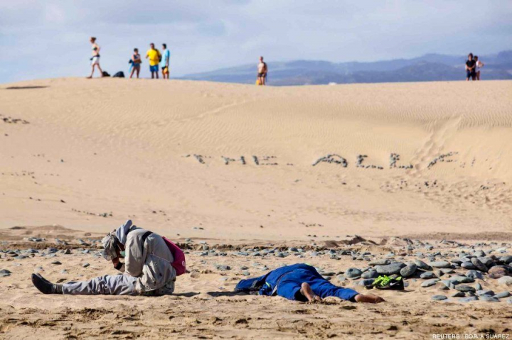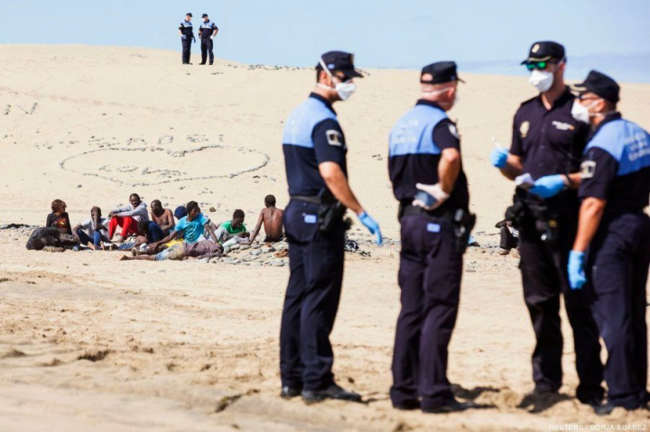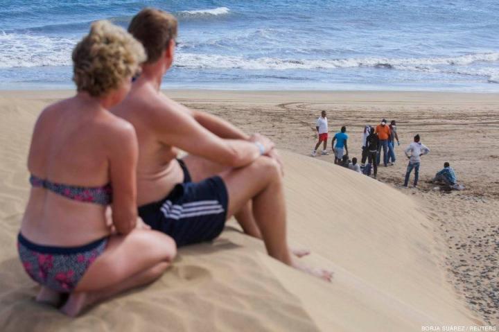 Las imágenes son suficientemente reveladoras. Unos turistas pasean por la playa mientras un grupo de inmigrantes esperan, durante horas, a que se les diga que se hará con ellos tras haber llegado en una patera.