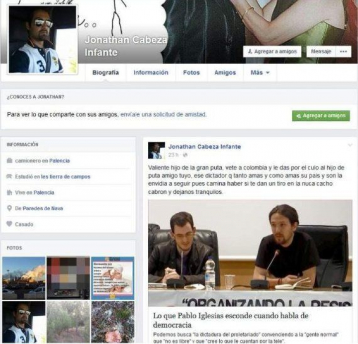 En un mensaje en su perfil de Facebook plagado de faltas de ortografía, Cabeza llama a Iglesias "valiente hijo de la gran puta" y "cacho cabrón" y afirma: "Haber si te dan un tiro en la nunca cacho cabron y dejanos tranquilos".