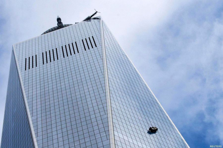 En las imágenes difundidas por el canal 7 de la cadena ABC se ha podido ver ver el andamio con una inclinación de 45 grados, pegado a la planta 69 del One World Trade Center, conocido como "Torre de la Libertad", en el centro financiero de Manhattan.