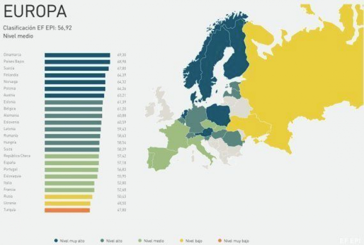 El nivel medio de los españoles está por encima del de países como Portugal, Italia o Francia. Con todo, sigue estando en el puesto 17, muy por detrás de los que mejor nivel tienen, como Dinamarca o Países Bajos, que encabezan la clasificación.
