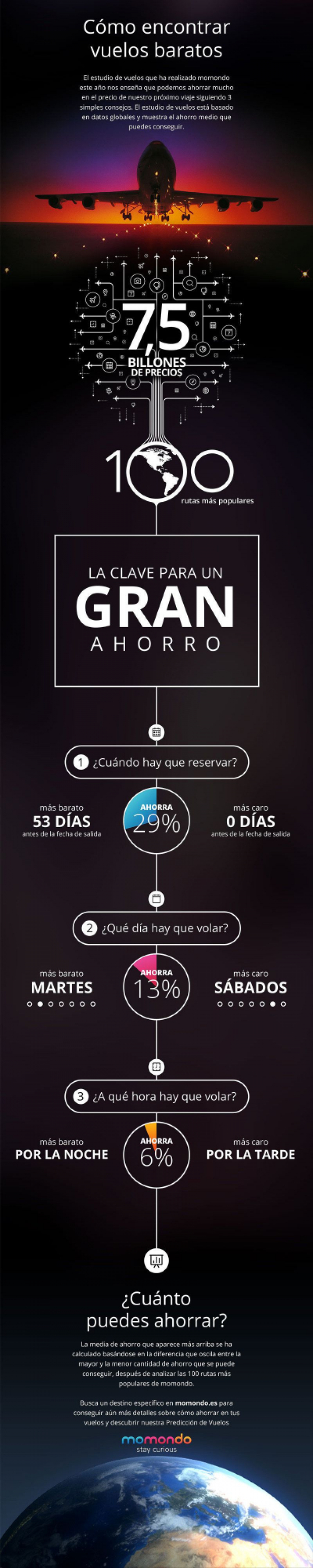 El buscador Momondo ha analizado 7,5 billones de precios para las cien rutas más solicitadas para averiguar cómo conseguir comprar billetes al mejor precio. En esta infografía tienes tres sencillos consejos para llegar a ahorrarte hasta un 29% en la compra de tus próximos vuelos. ¡Buen viaje!