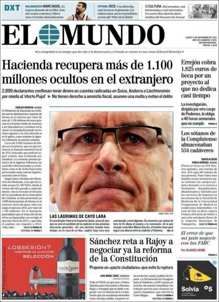 "Los 62 de Iglesias". El País analiza los 62 cargos del Consejo Ciudadano, máximo órgano del nuevo partido, y concluye que la mitad proviene del campo académico. "Es un equipo joven, competente e ilusionado" resume el propio Pablo Iglesias. "Satán, en el Nuevo Apolo" como le define con ironía Raul del Pozo en la última de El Mundo. "Es curioso -escribe- que el nuevo partido haya aparecido en un escenario, el del teatro de la madrileña calle de Alcalá, que confirma que la política es la última industria de la sociedad del espectáculo". Este diario, en primera, apunta a Iñigo Errejón, el responsable de la Secretaría Política de Podemos, que cobra una beca de 1.825 euros al mes "por un trabajo al que apenas se dedica". Se trata de una investigación para la Universidad de Málaga para el que le contrató otro dirigente de Podemos y que requiere 40 horas semanales que no cumple.