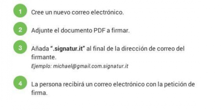 Lo único que hay que hacer es añadir .signaturit.com a la dirección de correo de quien tenga que firmar el documento adjunto en PDF. Esa persona recibirá un aviso desde el que podrá firmar el documento y enviarlo de vuelta. Todo ello además de forma segura y fiable, cumpliendo con las directivas de la UE sobre firma electrónica y protección de datos.