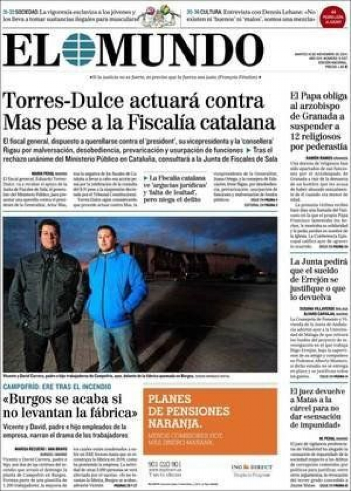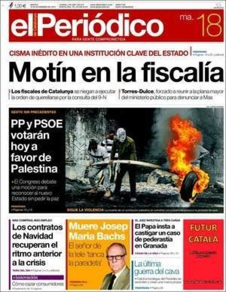 "Motín en la fiscalía", no duda en titular en primera El Periódico la discrepancia entre Torres Dulce y el fiscal jefe de Cataluña que, a juicio de ABC, debe ser cesado como ya lo fue su antecesor por mostrarse a favor del proceso soberanista. En esta línea, como comenta el Ojo Izquierdo, El Mundo, en su editorial, cree que la negativa de los fiscales catalanes demuestra "hasta que punto el nacionalismo se ha infiltrado en las instituciones". El Correoadvierte que la posible querella no va a facilitar precisamente la nueva estrategia del Gobierno para la que Rajoy, nos desvela La Vanguardia, no sólo ha consultado al actual líder del PSOE, Pedro Sánchez sino que Pérez Rubalcaba y Felipe González ya han desfilado por La Moncloa.