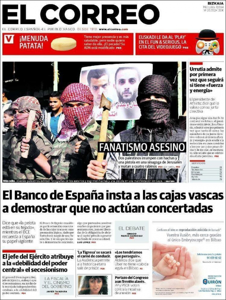 O "un paso significativo" como define El País el "reconocimiento de Palestina" por el Congreso. En su editorial, el diario global clarifica que "el atentado de Jerusalén realza la necesidad de respaldar el proceso de paz en Oriente Próximo", como hace la Unión Europea, pero sin que esto suponga que ese reconocimiento, cuando se produzca, deba "interpretarse como una toma de posiciones contra nadie". En esta línea, el Mundo elogia la equidistancia de la postura española con Palestina e Israel para no soliviantar aún más a sus dirigentes en un momento que el New York Times, en su editorial, no duda en calificar como "horror en Israel". El problema de fondo, como reseña Die Welt, es que "israelíes y palestinos no están interesados, actualmente, en la paz" y europeos y estadounidenses tienen problemas más importantes con los que lidiar.