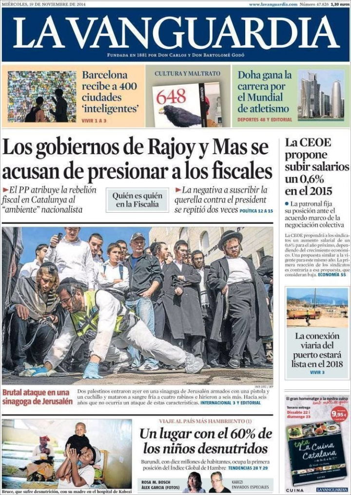 "Torres Dulce contra las cuerdas" asegura en primera El País. "Los fiscales culpan al Tribunal Constitucional para proteger a Mas", señala El Mundo. "Torres Dulce maniobra para blindar la querella", concluye El Periódico. El escritor Antoni Puigverd resume en La Vanguardia: "España es una olla a presión". Y explica, "el control del estado en democracia no es fácil. Las revueltas de fiscales, las críticas de los jueces y las reflexiones en voz alta de los militares son la evidencia de que España es una olla a presión calentándose al fuego con la válvula obturada".