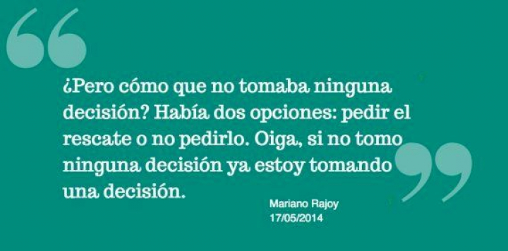 Sobre el rescate Rajoy nos ha dejado muchas frases memorables, pero la pronunciada en mayo de este año en Barcelona es una de nuestras favoritas. Rajoy se volvía a referir una vez más al hecho de que hace dos años "todo el mundo" le preguntaba si iba a pedir el rescate. Muchos, ha asegurado, le criticaron porque "no tomaba ninguna decisión". Y esta es su respuesta...