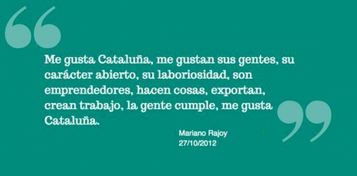 Desde que comenzó la legislatura, Rajoy ha vivido "en el lío" con el tema catalán. Para contrarrestar la multitudiaria Diada independentista del 11 de septiembre de 2012, un mes después el PP lanzaba una serie de vídeos en la que sus dirigentes enviaban mensajes bajo el lema "Nos gusta Cataluña". Rajoy tiene claro el porqué: "los catalanes hacen cosas". Si te crees que esta frase es textual, puedes ver el mensaje del presidente del Gobierno en este vídeo.