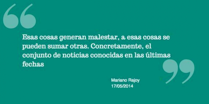 El PP, asediado por los escándalos de corrupción: el 'Caso Gürtel', los 'papeles de Bárcenas', las tarjetas black de Caja Madrid, la 'operación Púnica'... Pero para Rajoy todo eso no son más que unas "pocas cosas". El pasado mes de octubre reconocía ante centenares de cargos del PP que en los "últimos tiempos" se han desvelado algunas noticias que afectan al partido que no les gustaría que se hubieran producido. Eso sí, pedía que se deje trabajar a la Justicia y aseguraba que "unas pocas cosas" no reflejan lo que es España y sus 46 millones de habitantes.