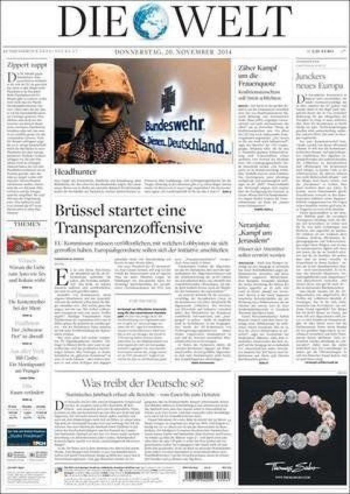 A falta de dinero, el flamante presidente de la Comisión ofrece transparencia. "Los comisarios deberán hacer público con qué lobbies se han reunido", titula Die Welt, que la considera "una medida que no será lo suficientemente elogiada" porque supone comenzar a cambiar Bruselas, donde se toman decisiones para la vid cotidiana de los europeos por una "tropa de tecnócratas opaca, incomprensible y sin control". Un apoyo al necesitado Juncker sobre cuya figura planea la moción de censura presentada, entre otros por el UKIP británico. El partido xenófobo come terreno a los conservadores y el Telegraph recoge la advertencia de David Cameron: "O la Unión Europea cambia, o nos vamos".