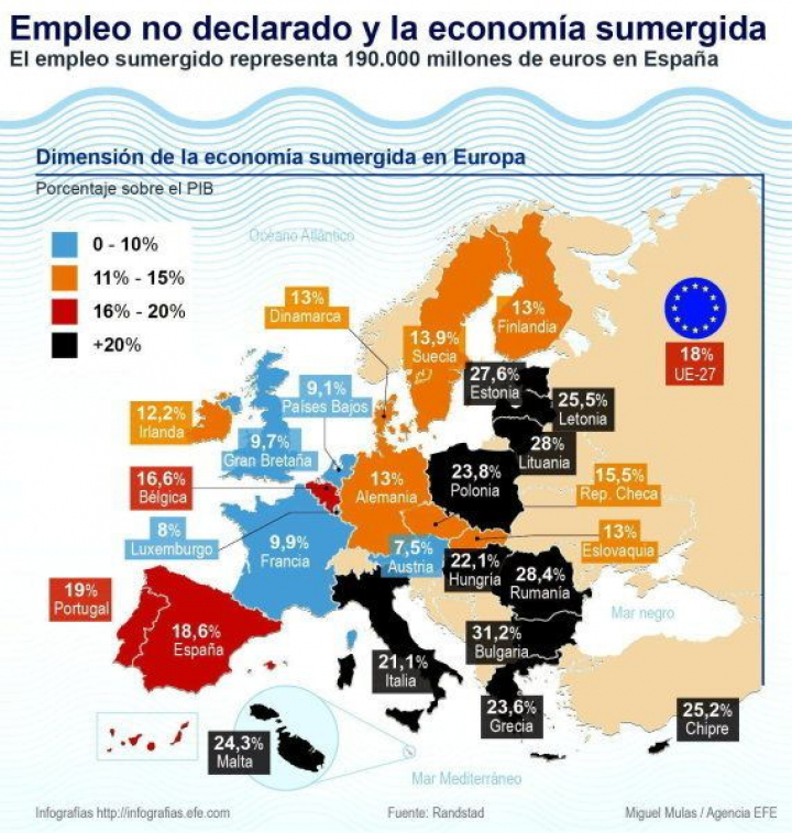 Las dimensiones asustan. La economía sumergida en España representa en torno a 190.000 millones de euros, el 18,6% del PIB, y dobla en proporción a la de países europeos como Francia, Alemania o el Reino Unido.
