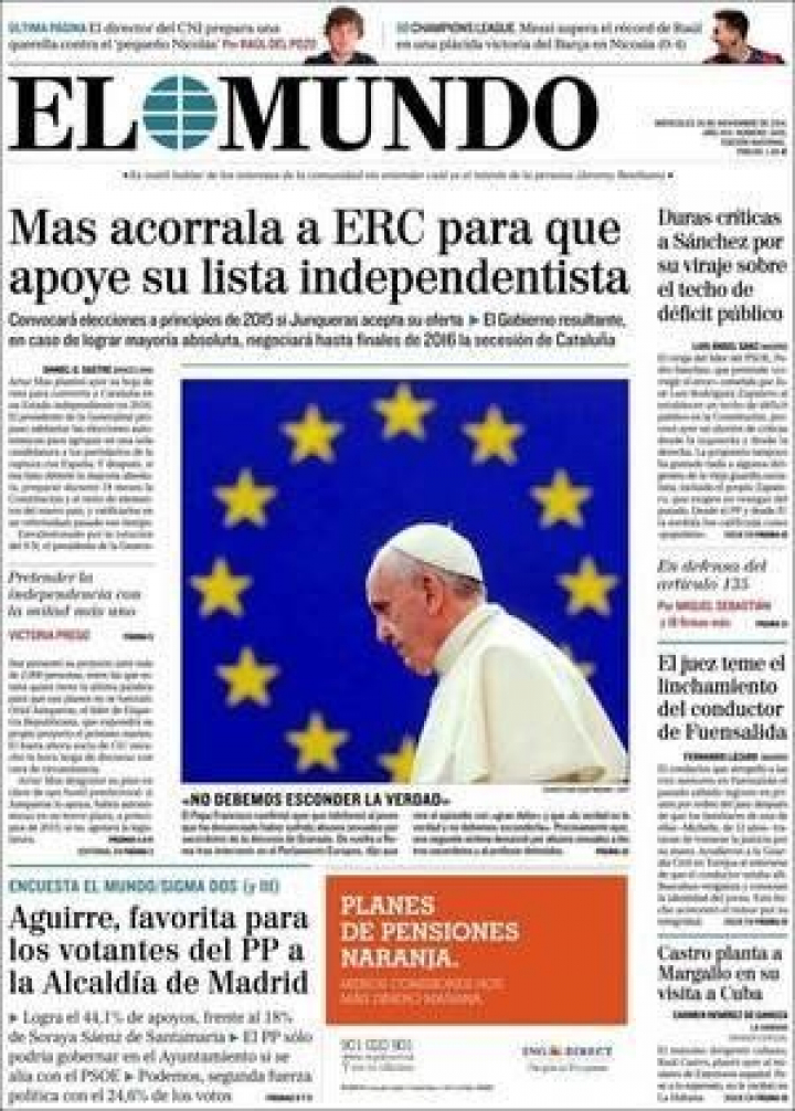 Una propuesta que abre la edición electrónica del Wall Street Journal y que es interpretada tanto por El Periódico como por El Mundo como una operación táctica, un intento del president de la Generalitat de "extremar la presión" o "acorralar" a Esquerra para que apoye su lista independentista. Es "una tela de araña", nos explica en La Vanguardia Antoni Puigverd, cuya presa es Oriol Junqueras; aunque el escritor echa en falta en el discurso de Mas a los otros catalanes. "La misma indiferencia que Rajoy muestra hacia unos catalanes, Mas la muestra hacia otros". El Correo, en un editorial, cree que "la lista única... reduce la cuestión catalana a un pulso entre quienes quieren la secesión y quienes no" pero no diluye "la responsabilidad creciente que debe asumir Rajoy, quien en su visita de este sábado a Cataluña deberá ofrecer algo más que los mensajes recurrentes, superados ya de largo por los acontecimientos".