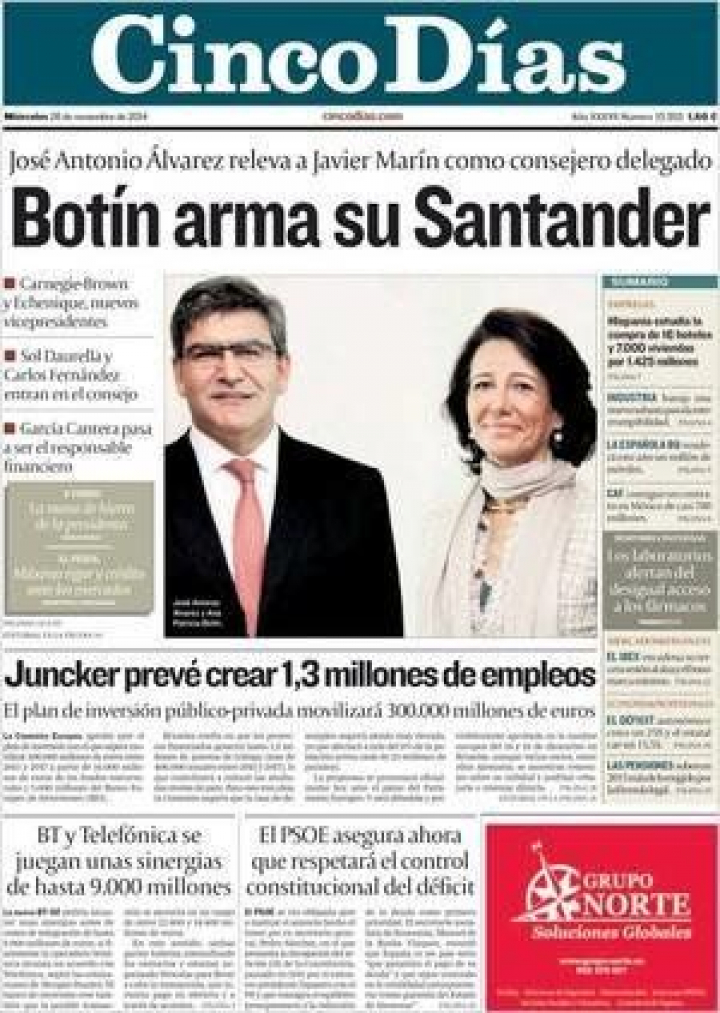 El plan de inversión público-privada que pretende movilizar 300.000 millones y crear, como nos anuncia en primera Cinco Días, 1,3 millones de empleos. Daniel Brössler, en el Südeutsche, insiste en el "efecto palanca" con el que la Comisión pretende multiplicar la inversión de 16.000 millones de euros de dinero público hasta los 315.000. En cualquier caso, no va a ser una varita mágica. Martin Wolf escribe en Financial Times y reconoce que parte de la solución podría ser, como apuntan varios economistas, reestructurar parte de la deuda que sigue atrapada en hipotecas. No va a ser fácil, argumenta, y es probable que en Europa no tenga el mismo efecto que en Estados Unidos.