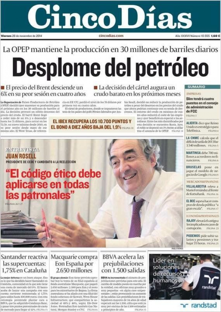 Más que caída, "desplome", como titula en primera Cinco Días, que asegura que la decisión del cártel de mantener la producción en 30 millones de barriles diarios "augura un crudo barato en los próximos meses".