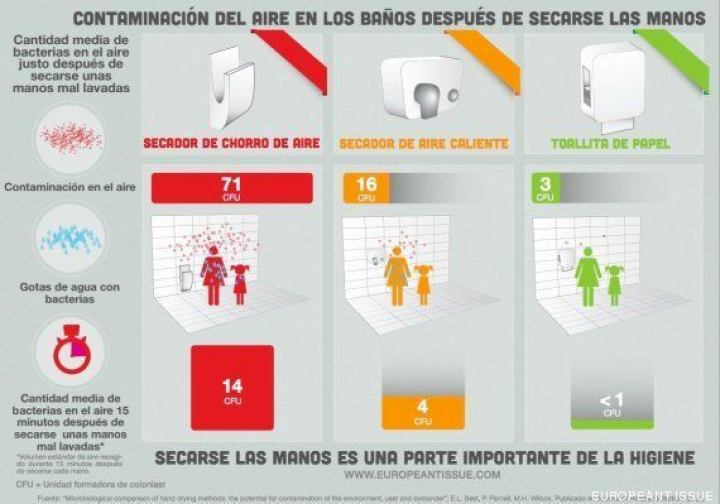 Pero si alguien piensa que está a salvo siempre que no toque nada, y que para ello nada mejor que los secadores de manos de activación automática, debería ponerlo en duda: otro estudio publicado recientemente por científicos de la Universidad de Leeds (Reino Unido) en la revista Journal of Hospital Infection concluía que la dispersión de bacterias en el aire es 27 veces mayor alrededor de un secador de manos que de las tradicionales toallitas de papel. El dato se refiere a los secadores de nueva generación en los que se introducen las manos entre chorros potentes de aire; este modelo, afirmaban los investigadores, dispersa 4,5 veces más bacterias que los clásicos secadores de aire caliente. Según el director del estudio, Mark Wilcox, "la próxima vez que te seques las manos en un baño público usando un secador de manos eléctrico, puedes estar dispersando bacterias sin saberlo. También te pueden salpicar los bichos de las manos de otras personas".