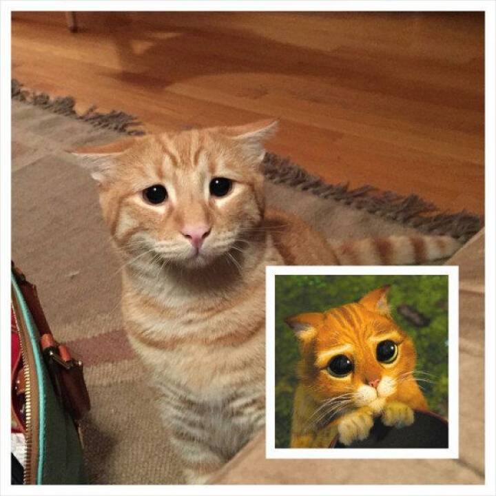El Gato con Botas ha salido en cuatro películas, tres protagonizadas por el ogro verde y el spin-off que rodó en 2011, pero a pesar de su fama todavía no había encontrado un doble en la vida real. Y eso que han pasado 10 años desde que Antonio Banderas le pusiese por primera vez voz enShrek 2 y que no han faltado los intentos de buscarle parecidos razonables. Pero eso ha terminado porque este lunes 1 de diciembre un usuario de imgur ha descubierto a mundo que su gato Marty es exactamente igual a el compañero de Shrek y Asno. Mira y compara. ¿Notas la diferencia?