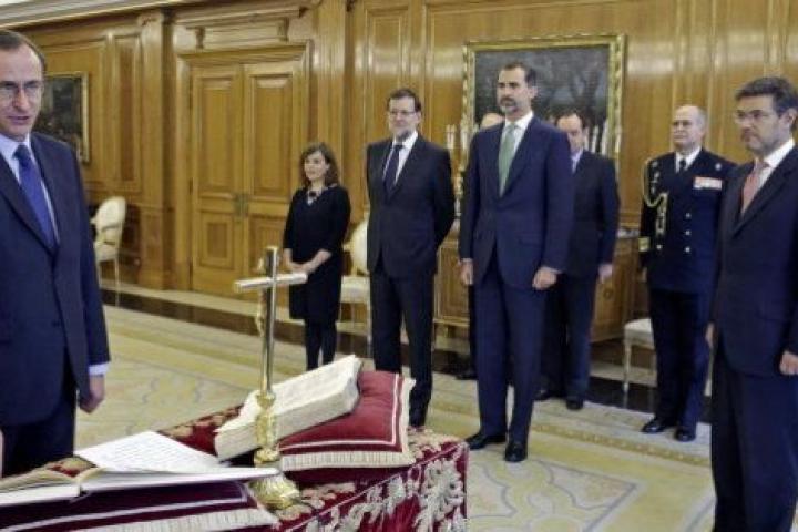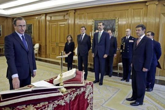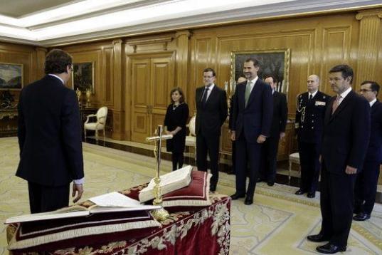 A la vieja usanza. El nuevo ministro de Sanidad, Servicios Sociales e Igualdad, Alfonso Alonso, ha jurado su cargo este miércoles ante el rey con la mano derecha sobre la Constitución, junto a una Biblia y frente a un crucifijo.