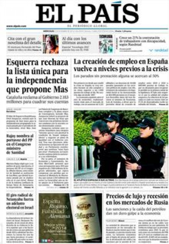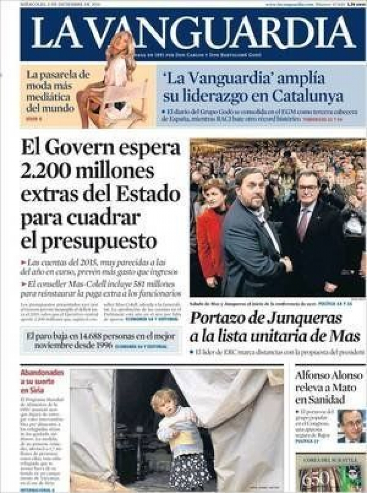 El líder de ERC "tiene prisa para que Mas adelante las elecciones, analiza Isabel García Pagan en La Vanguardia, porque ve vida más allá del escrutinio, mientras que para Mas se trata de la última oportunidad". El president, que asistió anoche a la conferencia de Junqueras, escuchó como desgranaba un plan que "está en las antípodas" del suyo, señala El Periódico, que recoge la confidencia hecha por Mas a Marta Rovira: "Yo aplaudo por educación, pero hago enmienda a la totalidad". Uno de los motivos de Esquerra es que un punto único, la independencia, en una lista única dejaría al resto de formaciones asuntos sensibles como la crisis y la corrupción. Es paradójico, por tanto, que Esquerra haya impedido que Mas comparezca en la comisión parlamentaria sobre "el caso Pujol" argumentando que la figura del president de la Generalitat en ejercicio es "inviolable", como señala El Paísen un editorial. Esquerra tampoco apoya un presupuesto que "reclama al Gobierno (central) 2.200 millones" y que para Màrius Carol es un "brindis al sol" porque tampoco el PSC le dará su respaldo pese a que "prevé un gasto social como el de hace una década".