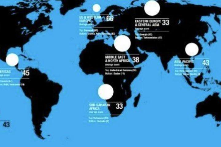 El informe también ordena las regiones en orden decreciente de transparencia, situando en primer lugar a Europa Occidental (66 puntos), seguida por Américas (45), Asia Pacífico (43), Oriente Medio y Norte de África (38), Europa del Este y Asia Central (33) y África Subsahariana (33).