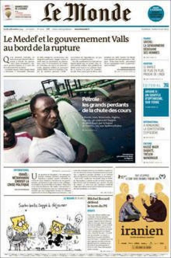 "Miedo al agujero negro que puede causar la pérdida de 316.000 millones de dólares por parte de la OPEP", asegura en primera el diario de la City que, en páginas interiores, analiza la situación sensible para China que, por un lado, se beneficia de la reducción del precio en su industria pero también pierde por ser el cuatro productor mundial. "Rusia, Irán, Venezuela, Argelia y Nigeria ven como su economía se ve desestabilizada por la bajada de los ingresos por hidrocarburos" precisa Le Monde. Son los grandes perdedores entre los productores. ¿También los consumidores? Vidal-Folch en El País plantea una cuestión de Perogrullo: si el precio del petróleo se abarata un 40% y el de la gasolina sólo un 8,4%, es que el saldo va al oligopolio y por tanto no beneficiará a la economía real.