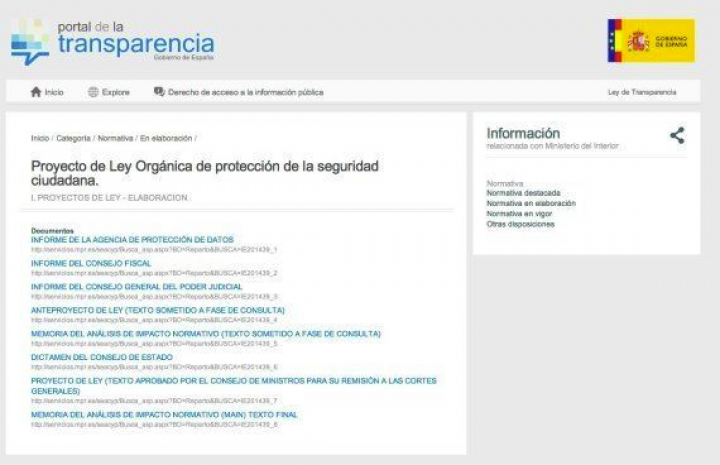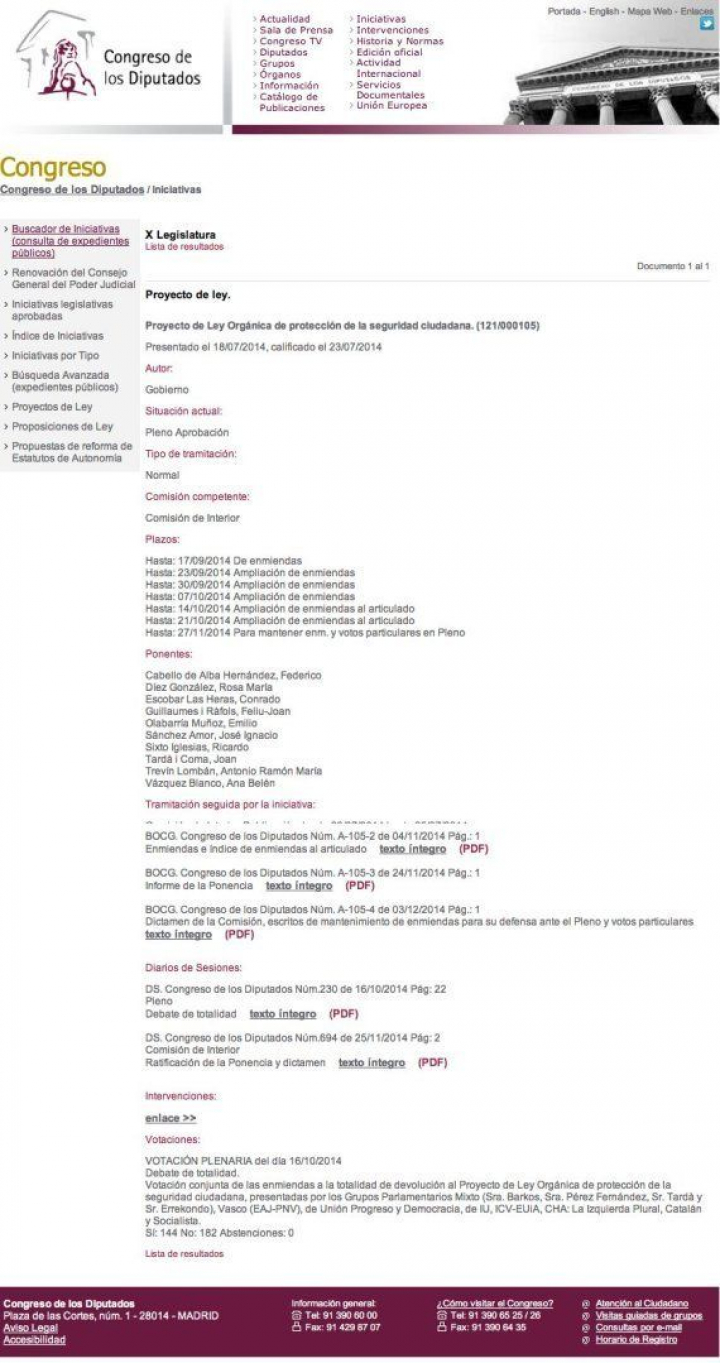 ¿Qué echamos de menos? Para empezar, no estaría de más indicar en qué fase del proceso legislativo se encuentra la normativa. Sería conveniente, y bastante fácil de hacer, añadir la fecha de los documentos, y que estos estén ordenados cronológicamente, o jerárquicamente según la institución, por aquello de tener un orden lógico. Sabemos que el texto ya ha pasado por varias fases en el proceso parlamentario. Se han hecho enmiendas (nos gustaría saber qué partidos han presentado cuáles), y se ha debatido en la Comisión de Interior (hay actas de lo que opinaba cada grupo), y ha salido un nuevo texto en el que se han suprimido artículos propuestos inicialmente, y se ha votado la propuesta de ley (¿qué ha votado cada diputado?). Entre la documentación que nos ofrece el flamante portal de transparencia no encontramos ninguno de esos documentos intermedios, y el caso es que existen y son públicos. No tenían más que cogerlos de la web del Congreso o, si las 36 personas volcadas en el proyecto y los 300.000 euros que ha costado la nueva web no daban para completarla, al menos podrían remitir a la fuente donde sí se encuentra esa información. Comparen: