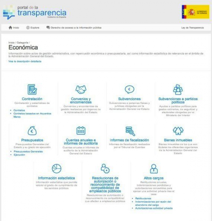 El tercero es el apartado más prometedor, pero se queda en eso, una promesa. Es el que recoge información de carácter económico, como datos sobre contratación, convenios, subvenciones, subvenciones a partidos políticos, información presupuestaria, cuentas anuales e informes de auditoría, inventario de bienes inmuebles de la Administración General del Estado, información estadística, resoluciones de autorización y reconocimiento de compatibilidad de empleados públicos, retribuciones de altos cargos, o autorizaciones concedidas para ejercer la actividad privada tras el cese. La mayoría de los datos que componen esta sección estaban también disponibles antes de la creación de este portal.
