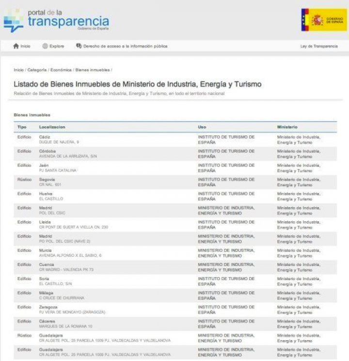 La información, de nuevo, podría ser mucho más útil para el ciudadano. Veamos por ejemplo el listado de bienes inmuebles de Ministerio de Industria, Energía y Turismo.