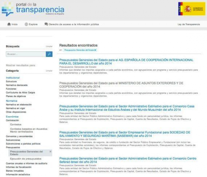 El listado general tampoco simplifica ni convierte en amigable los laberínticos tomos amarillo, verde, rojo y gris de los presupuestos. Lo que el usuario encuentra es un listado de 20 páginas sin un orden aparente en el que se mezclan partidas como los "Presupuestos Generales del Estado para el AG. ESPAÑOLA DE COOPERACIÓN INTERNACIONAL PARA EL DESARROLLO del año 2014" con los "Presupuestos Generales del Estado para el Sector Administrativo Estimativo para el Consorcio Casa Árabe y su Instituto Internacional de Estudios Árabes y del Mundo Musulmán del año 2014".