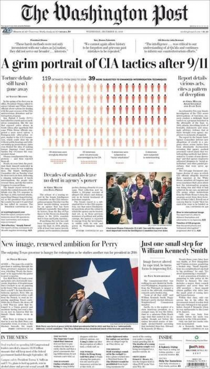 "Un retrato sombrío de las tácticas de la CIA". Es la valoración que en su titular de primera realiza el Washington Post, que contrapone de manera destacada las contradicciones y falsedades entre lo que dice el informe del Senado y lo que dijo el que era director de la CIA en 2007, Michael Hayden, cuando se iniciaron las investigaciones.