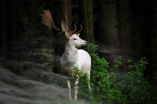 Descripción de la imagen: Un venado blanco entre la niebla de la mañana ...