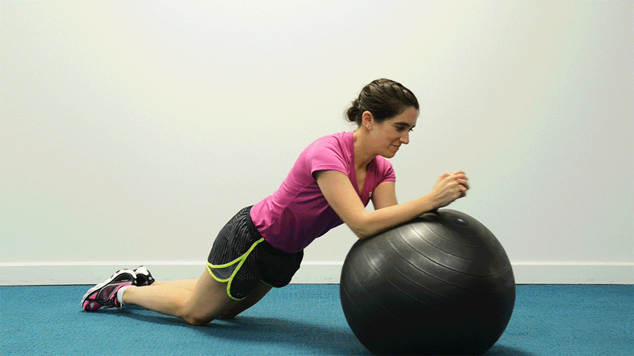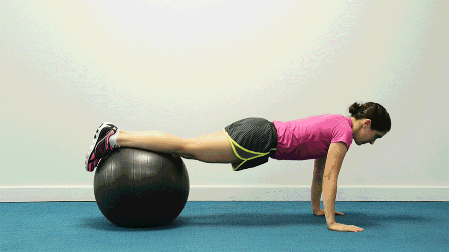 Cualquier movimiento con la pelota de estabilidad funciona bien, ya que se trabajan los músculos para mantener el equilibrio. Empieza tumbada con los tobillos encima del balón. Utilizando el tronco, impulsa las rodillas hacia el pecho. Las caderas se elevarán a medida que la pelota se mueve hacia los brazos. Luego, vuelve a la posición original de la pelota. Repite 10 veces.