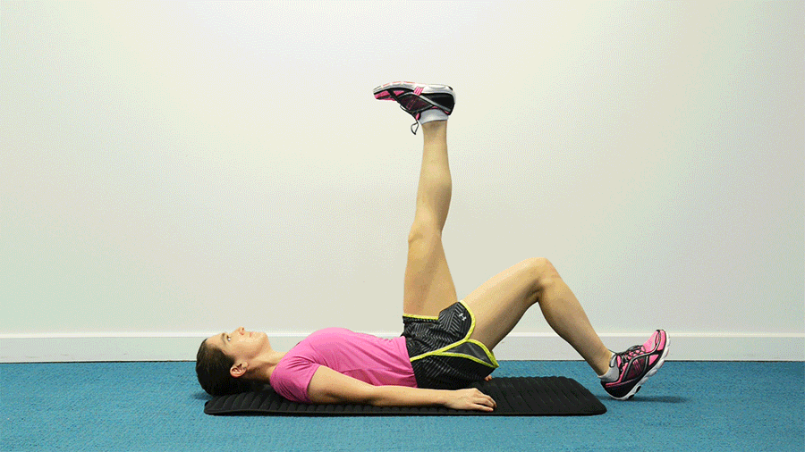 Mantener el equilibro con una sola pierna requiere el ejercicio de los músculos del tronco para dar estabilidad al cuerpo cuando subes y bajas. Tumbado boca arriba con los brazos a los lados, apoya el talón derecho en el suelo y extiende la pierna izquierda hacia el techo. Presionando el talón derecho, levanta las caderas hasta que la columna se quede recta. Luego, baja las caderas poco a poco para volver a la posición del principio. Hazlo 12 veces con cada pierna.