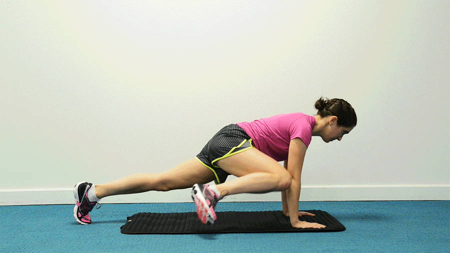 Manteniendo las caderas al mismo nivel, acerca la rodilla derecha al codo derecho. Cambia de pierna cada 30 segundos. Para dificultar el ejercicio, trata de llevar la rodilla al codo opuesto.