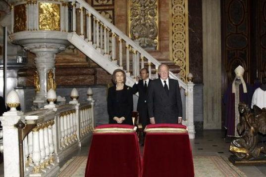 Después, ambos han subido las escaleras, el rey Juan Carlos del brazo de Alfonso Díez y la reina Sofía con el duque de Huéscar, y en el acceso a la basílica han saludado a los demás hijos de la duquesa, así como a la mayoría de sus nietos.