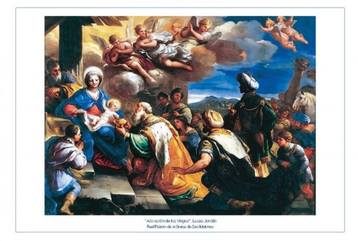 La felicitación de los padres del actual rey es clásica: está ilustrada con el cuadro La Adoración de los Magos, de Lucas Jordano, del Real Palacio de la Granja de San Ildefonso.