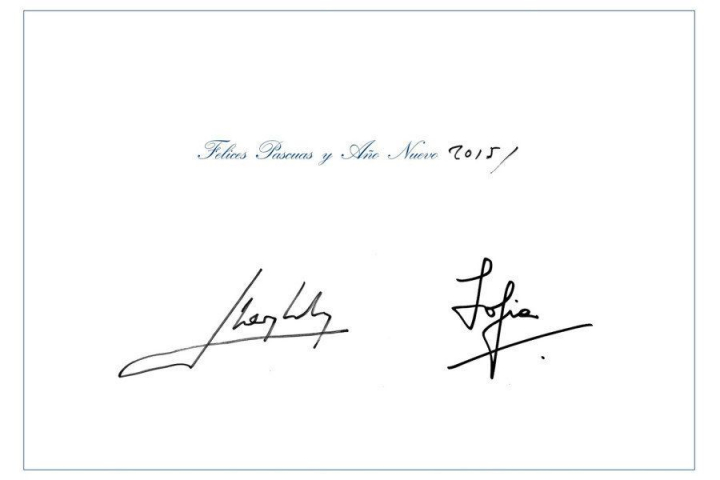 Las firmas de Juan Carlos y Sofía pierden la R de rey y reina que llevaban al final de sus nombres durante décadas, y que ya ha pasado a Felipe y Letizia. Van acompañadas de la frase mecanografiada "Felices Pascuas y Año Nuevo", mientras que el año, "2015", está escrito a mano, como cada año.