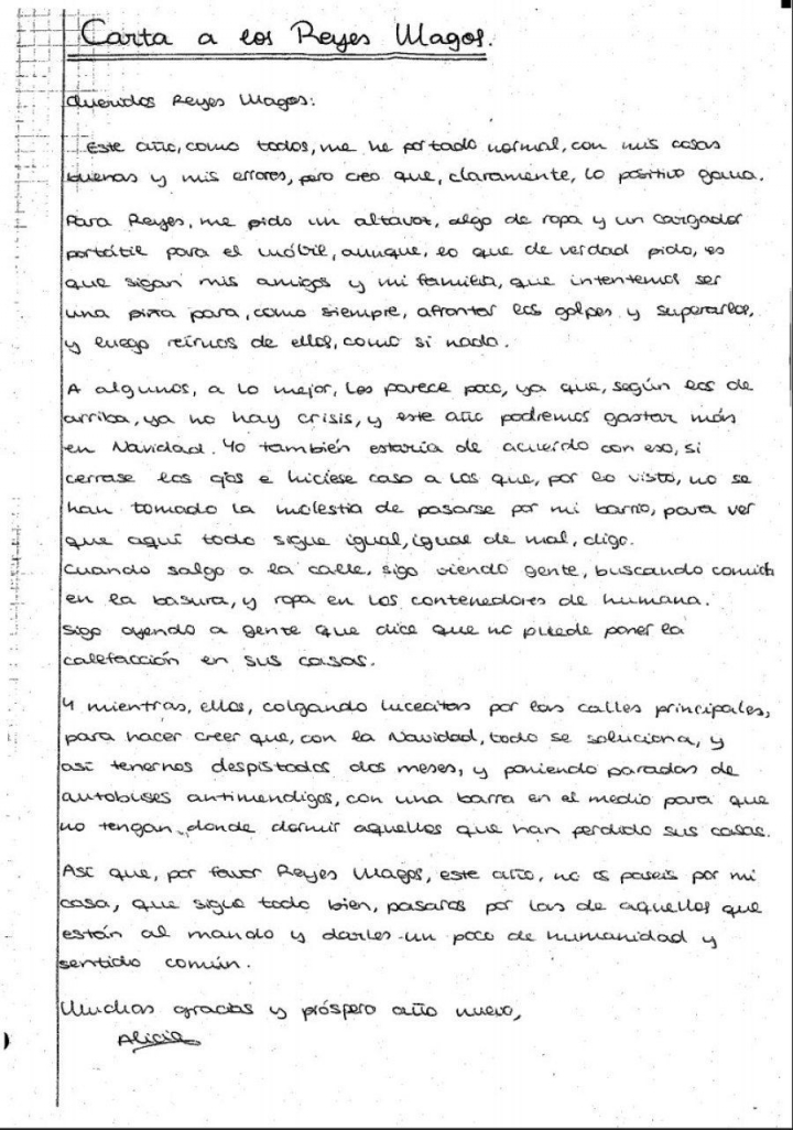 Mientras, subraya, "los de arriba" siguen poniendo paradas de autobuses antimendigos, con una barra en el medio para que no tengan donde dormir aquellos que han perdido sus casas". "Así que, por favor reyes magos, este año no os paséis por mi casa, que sigue todo bien. Pasaros por las de aquellos que están al mando y darles un poco de humanidad y sentido común", concluye Alicia.