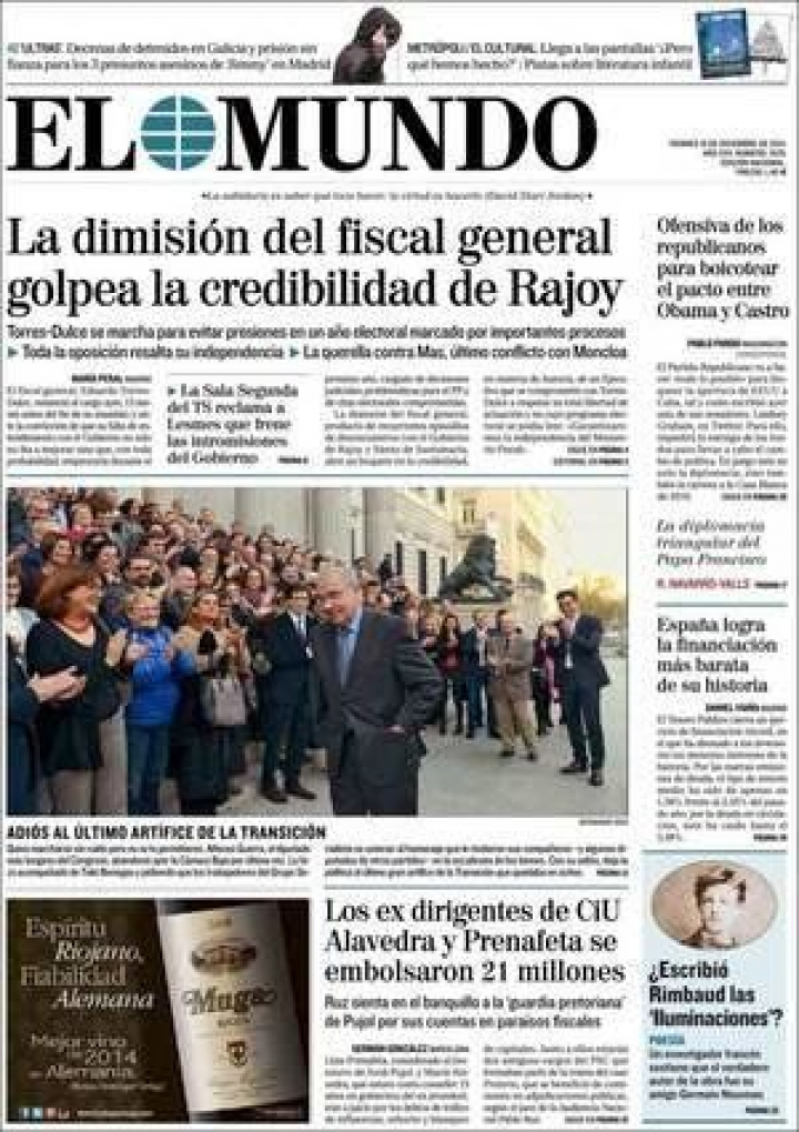 "Torres Dulce deja su cargo entre dudas por la decisión del Tribunal Superior de Cataluña sobre la admisión de la querella contra Mas", señala El País, adelantando