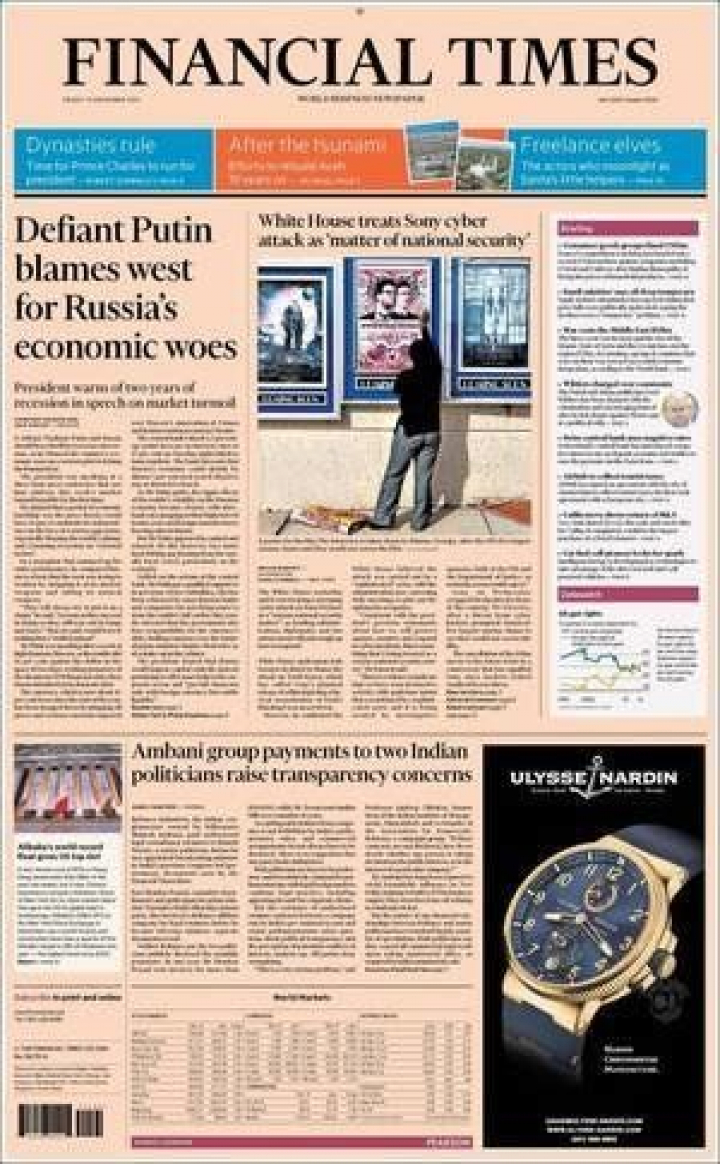Y con dureza. El francés Le Figaro titula "el show de Putin, vacío" mientras el británico The Guardian resume: "todo está bien". Porque como señala en primer el Financial Times: "un Putin desafiante culpa a Occidente de los males de Rusia y anuncia dos años más de recesión". Y es probable porque como asegura Die Welt: "Merkel mantiene a los europeos a raya sobre la cuestión de Rusia". La canciller estima que a pesar de la caída de la moneda rusa, no hay razón alguna para retirar las sanciones que, recordó, se adoptaron por unanimidad. El caso es que ya hay voces discrepantes. El canciller austriaco señaló que las sanciones son una especie de autodefensa, pero no pueden convertirse en una religión".