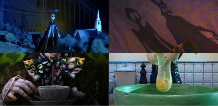 Imagen arriba a la izquierda: Beetlejuice. Arriba a la derecha: La princesa y el sapo. Abajo a la izquierda: Alicia en el país de las maravillas. Abajo a la derecha: Los mundos de Coraline.