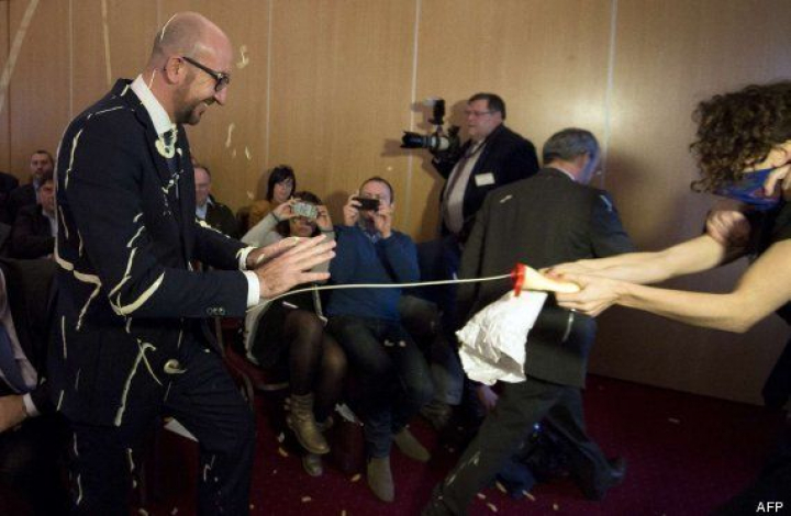 El primer ministro belga, el liberal Charles Michel, ha sido atacado este lunes con mayonesa y patatas fritas -consideradas el plato nacional de Bélgica- por varias representantes del movimiento feminista 'Lilith' en protesta por la austeridad cuando se disponía a dar un discurso sobre la política económica de su Gobierno ante el círculo de empresarios de Valonia en la ciudad de Namur.
