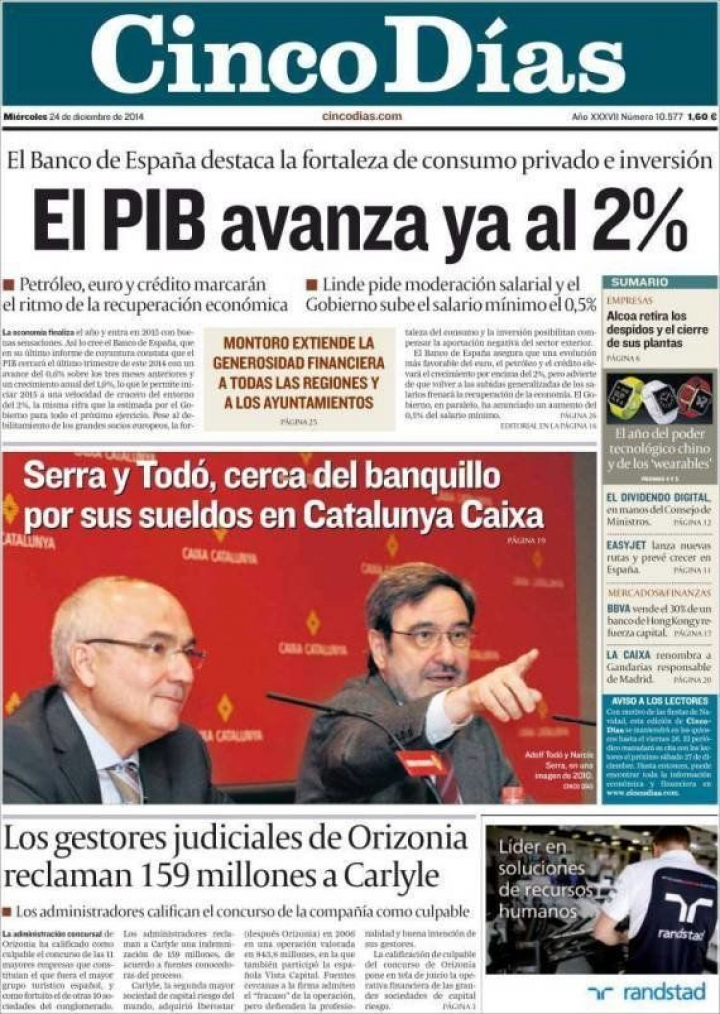 La estrella de Belén, con todas las puntas recortadas, exhibe sin embargo una puntiaguda en el firmamento del pueblo de Blasa. Y su amiga le dice: "¡Mira Blasa: se le ha reactivao un recorte!". A lo que la anciana imaginada por Forges responde: "Un milagro del ninio Jesús, porque lo que es por estos enteraos..." La prensa especializada, como Cinco Días, se muestra optimista: "El PIB avanza ya al 2%. El Banco de España destaca la fortaleza de consumo privado e inversión" aunque también advierte de la necesidad de mantener la moderación salarial. Porque en realidad, como asegura El Paísen un editorial, ésta reactivación tiene lugar "con la ayuda del dólar". La depreciación relativa del euro y la caída del petróleo apoyan la recuperación europea en 2015. No obstante, advierte el diario global, "el hecho de que las condiciones externas mejoren no implica que Europa se olvide de articular las políticas que son necesarias", léase "un programa de compra de deuda y la coordinación de un plan de inversiones que genere puestos de trabajo". Sobre todo porque esto ha funcionado en Estados Unidos que ya registra el mejor crecimiento de la última década -un 5% en el tercer cuatrimestre- señalaFinancial Times mientras que el Washington Postprevé un "boom" económico para el año que viene con crecimientos no registrados desde finales de los 90.