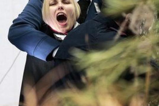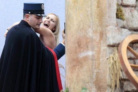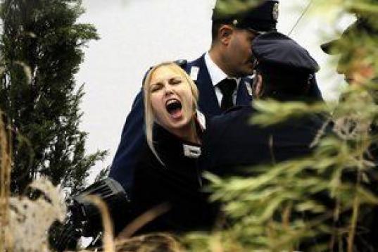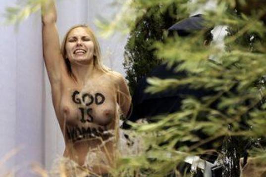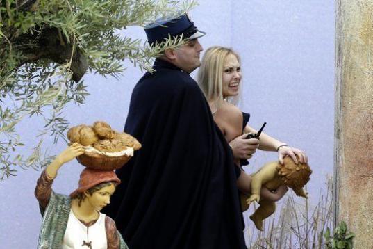 Una activista del grupo feminista Femen se ha colado en la plaza de San Pedro, en el Vaticano, el día de Navidad. Con el pecho desnudo y la inscripción "God is Woman" (dios es mujer) en el torso, ha corrido para coger en brazos el niño Jesús de un nacimiento de tamaño real, pero ha sido rápidamente detenida por un agente de policía.