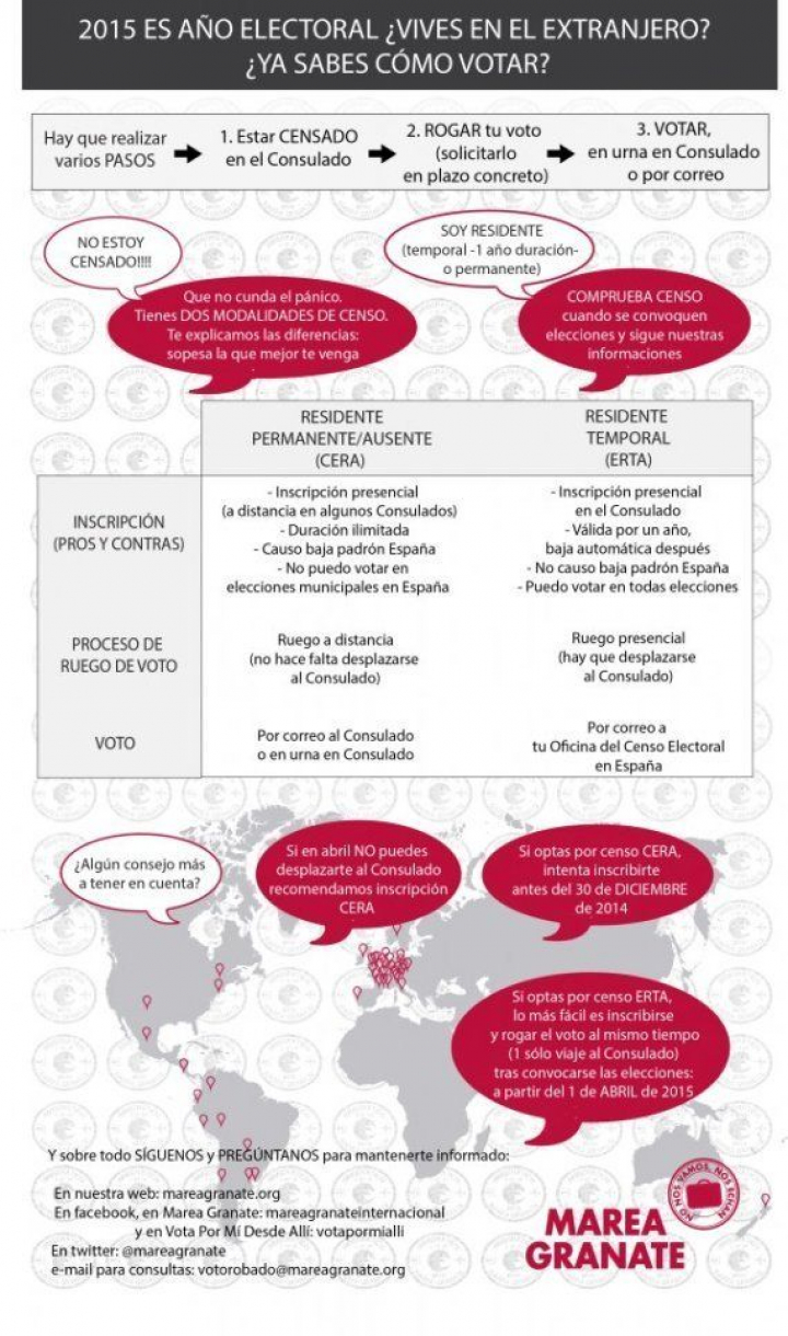 El colectivo Marea Granate, que aúna a los miles de españoles que han tenido que marcharse al extranjero en busca de un futuro mejor, denuncia que desde que se comenzó a aplicar la reforma de la ley electoral en 2011, la falta de información y las trabas burocráticas impiden que la mayoría de los residentes en el exterior puedan participar en los procesos electorales.