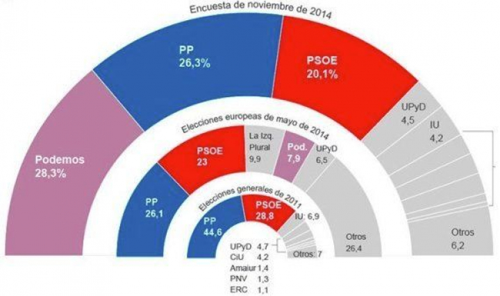 Una encuesta de Sigma Dos para el diario El Mundo elaborada en noviembre daba a Podemos como primera fuerza política con un 28,3% de los votos, frente al 26,3% del PP y el 20,1% del PSOE.