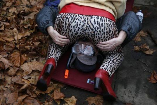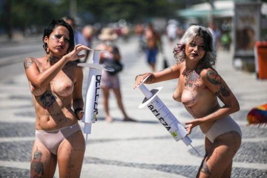 Dos feministas brasileñas protestan en Río de Janeiro (Brasil) en contra los tratamientos de estética a los que las mujeres se someten por los imperativos de la "dictadura de la belleza" poniendo en riesgo su vida.
