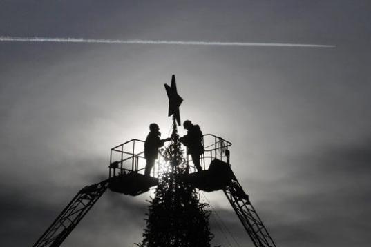 Trabajadores decoran un árbol de Navidad en Lenin's Square en Stavropol (Rusia) mientras pasa un avión.