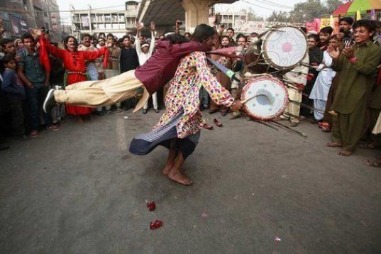 Un devoto gira mientras toca el tambor para equilibrar su peso mientras otro cuelga de su espalda, en Lahore, Pakistán.