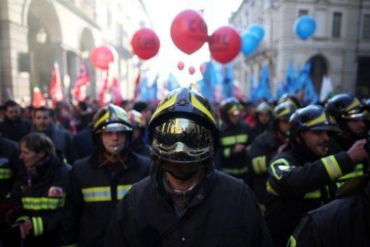 Bomberos marchan en Turín durante una huelga general en protesta contra el Gobierno de Matteo Renzi por su reforma laboral.